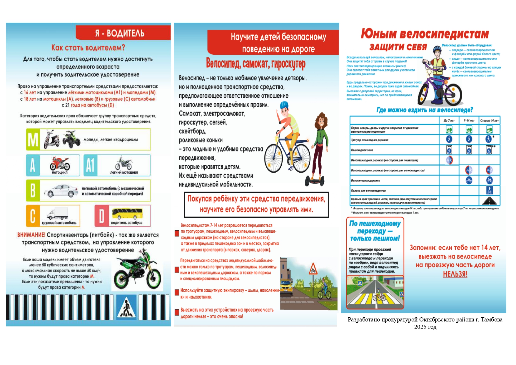 Памятка «Я – водитель, я – пешеход», разработанная прокуратурой Октябрьского района г. Тамбова для размещения в образовательных и социальных учреждениях, летних оздоровительных лагерях, информационных платформах.